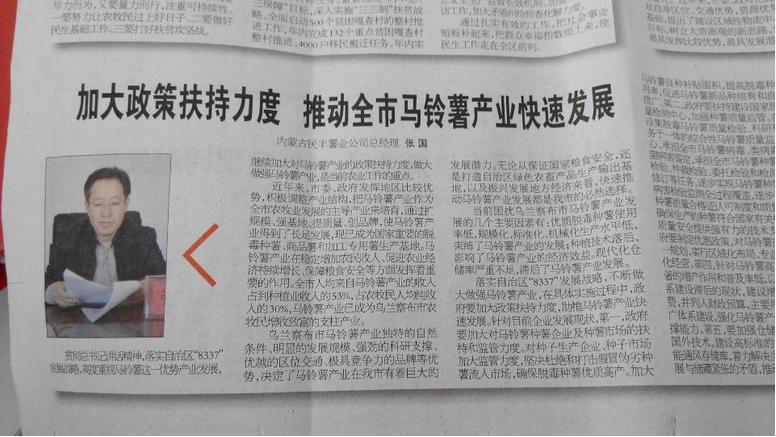 張國(guó)表示,民豐薯業(yè)將堅(jiān)定貫徹總書記講話精神,落實(shí)自治區(qū)“8337”發(fā)展戰(zhàn)略,充分發(fā)揮龍頭企業(yè)帶動(dòng)、幫扶作用,為推動(dòng)我市馬鈴薯產(chǎn)業(yè)快速發(fā)展做出新貢獻(xiàn)。